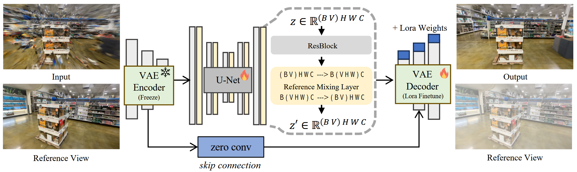 如图,输入为 3DGS 的新视角合成图像,参考图像为稀疏视图的真值图像。通过一个以 U-Net 为基础架构的 Diffusion 模型,将输入图像增强成清晰的图像输出。输出图像反过来作为 3DGS 网络的约束,再一次训练 3DGS 网络。
