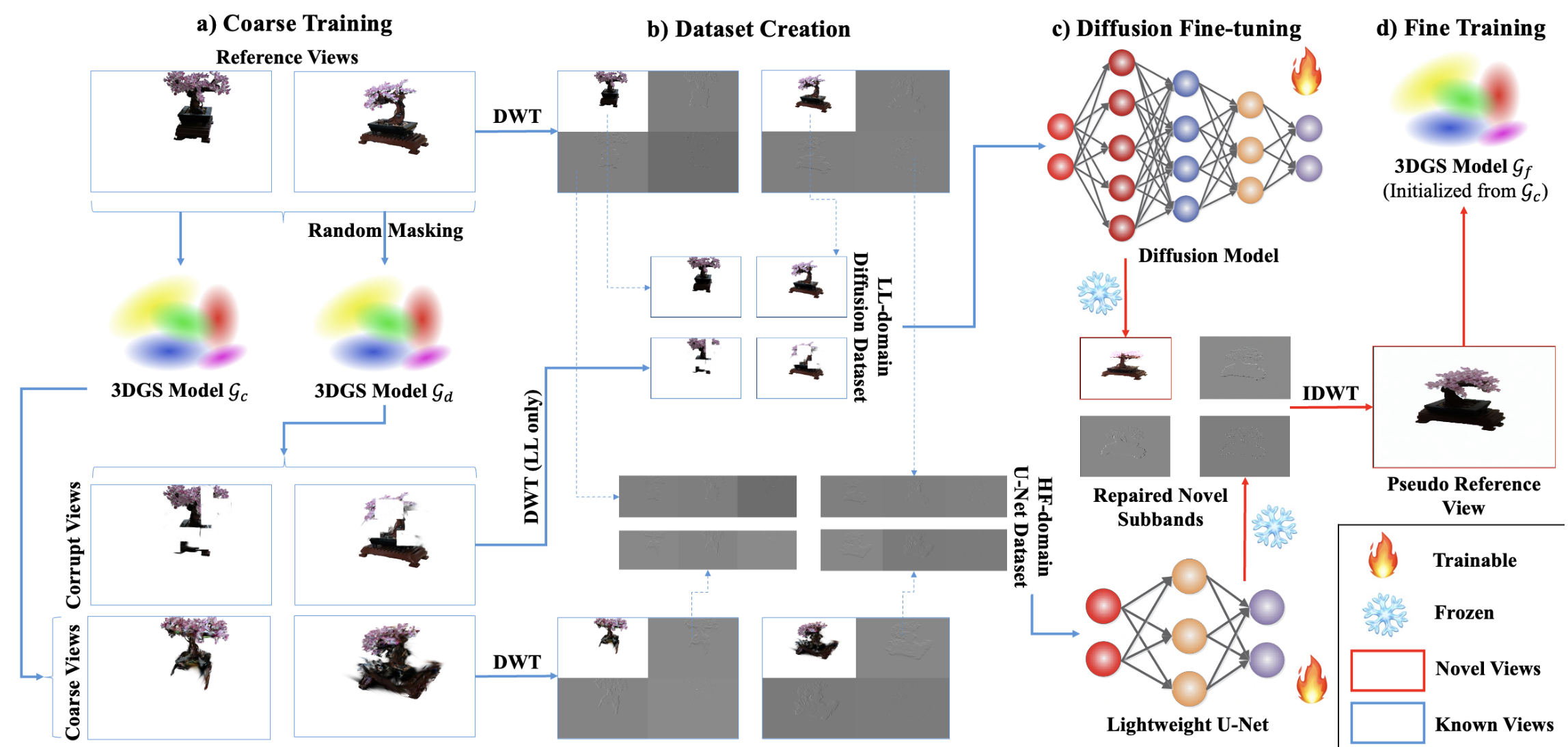 如图所示,输入的稀疏视角为左上角的参考视图,对参考视图直接进行 DWT,得到四个分量作为真值;使用原始的稀疏视图构建一个 3DGS 模型 Gc ,经过 Gc 生成的新视角为粗视图(Coarse Views),将粗视图进行 DWT,获取它的 LH、HL、HH 三个分量,在轻量的 U-Net 中进行细化;再将原始的稀疏视图加一个随机的 Mask 构建一个 3DGS 模型 Gd ,经过 Gd 生成的新视角为有损视图(Corrupt Views),将其进行 DWT 并获取它的 LL 分量,对 Diffusion 进行微调。