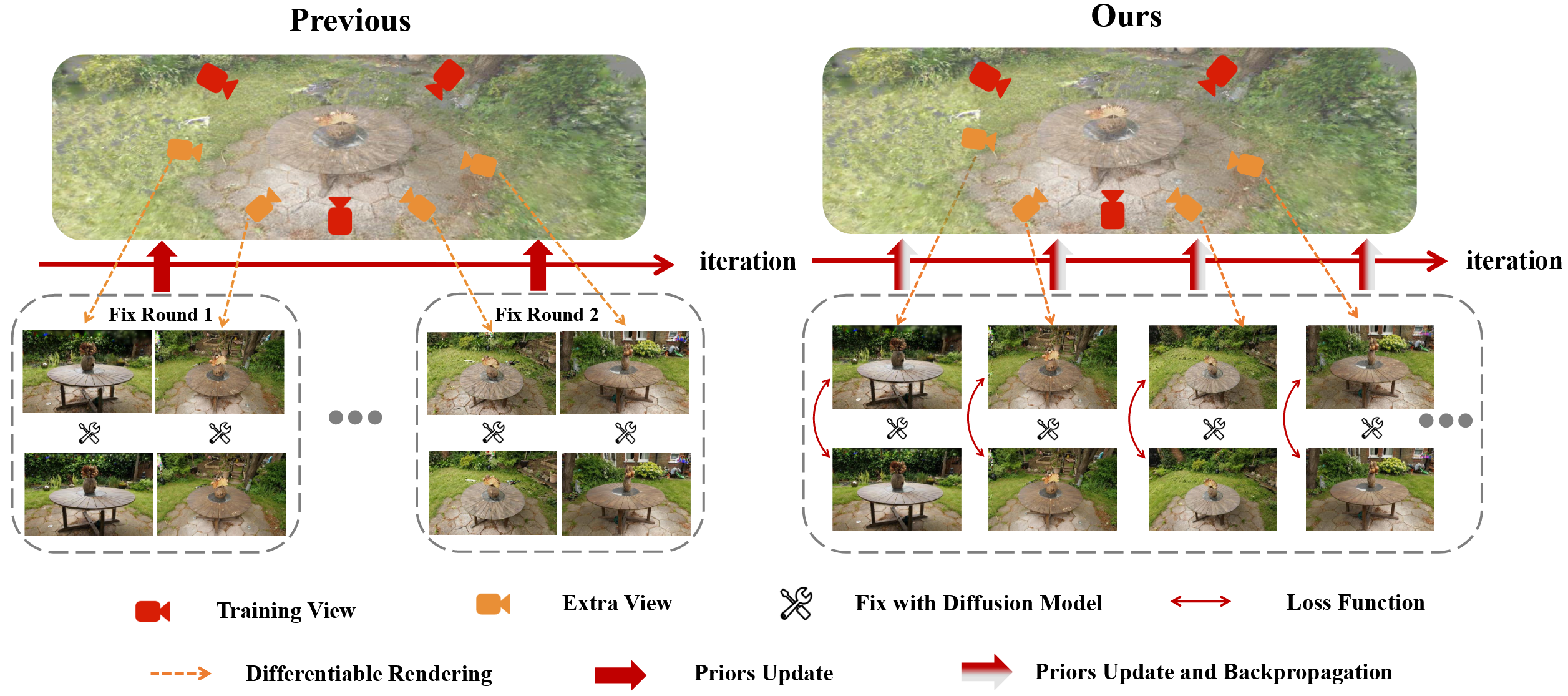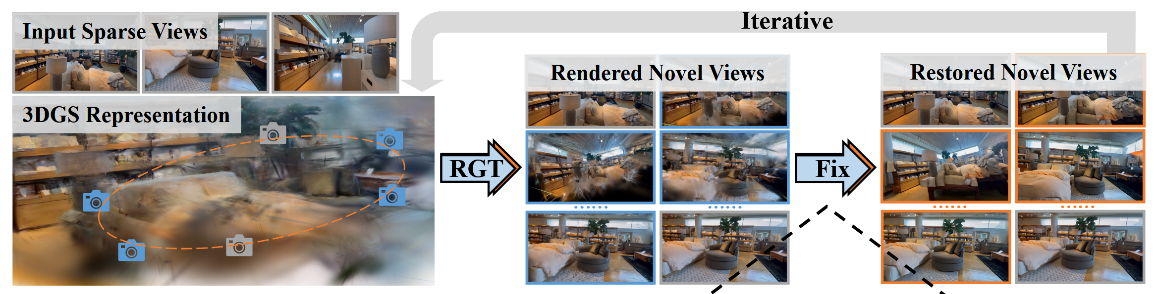 上述两种方法如图左,通过对新视角采样,得到合成视图,增强后再输入回 3DGS,进行一轮一轮的训练。然而,这样的训练方式会导致一个问题:前期得到增强的伪标签约束质量并不高,但会在之后的训练中持续影响训练效果,这使得即使训练多轮,效果提升也十分有限。