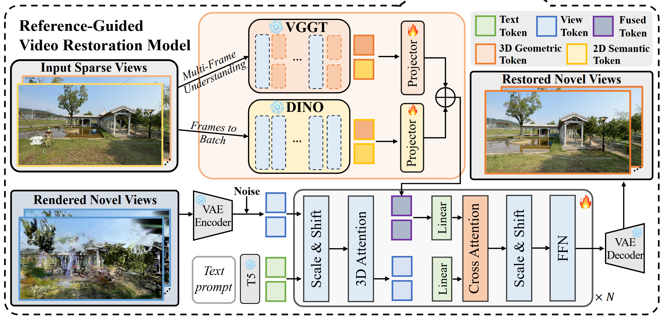 如图,该架构的名字是参考引导的视觉重建模型(Reference-Guided Video Restoration Model)。输入 3DGS 渲染的新视角图像和稀疏视图真值;对于真值,使用 VGGT 提取其 3D 特征,使用 DINO 提取其 2D 特征,将二者统一维度后融合,作为 Fused Token;对于场景的描述文本,提取其语义信息,作为 Text Token;对于新视角合成图像,输入到 Diffusion 模型中,其中 Encoder 依然是冻结的预训练参数,该 Diffusion 模型基于 Transformer 架构进行训练,利用多个模态的特征,最终还原一个清晰的新视角图像。