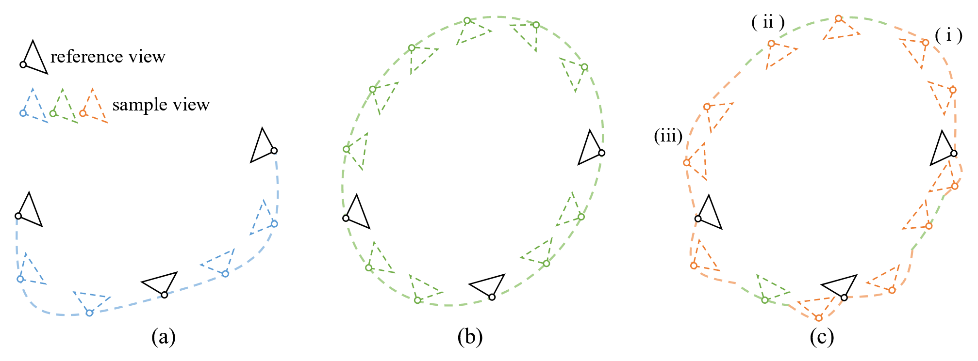 图 (a) 为插值轨迹,图 (b) 为椭圆轨迹,而图 (c) 则为参考引导轨迹。插值轨迹的质量较高,但角度泛化性不足;椭圆轨迹的视角广泛,但质量次优。因此,为了平衡两种轨迹,参考引导轨迹的策略为:首先从参考视图插值到球面路径上最近的视点,沿球体路径对其他视图进行采样,然后插值到下一个最近的参考视图。
