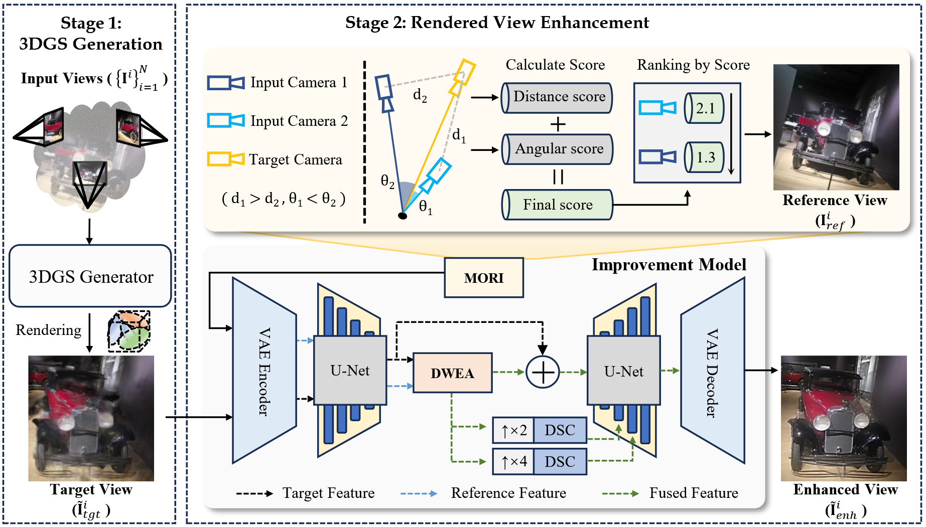 如图,ProSplat 方法分成了三个部分。第一部分是 3DGS 生成部分,稀疏视图约束生成的新视角图像比较模糊;第二个部分是对参考视图进行选择,这里主要用了文中提出的 MORI 方法;将前两部分的结果送入到基于 U-Net 的 Diffusion 网络中进行训练,其中还加入了文中提出的 DWEA 方法进行特征匹配,最终训练一个 Diffusion 网络对新视角合成的图像进行修复。