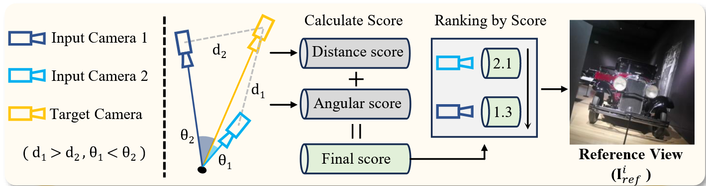 如图,对于黄色的目标视角,稀疏视图的约束有两个,通过计算视图间的偏移量和旋转角度进行近似程度的比较,选择与目标视图最接近的约束作为参考视图。这样可以最大化利用该稀疏约束,也最具有参考价值。