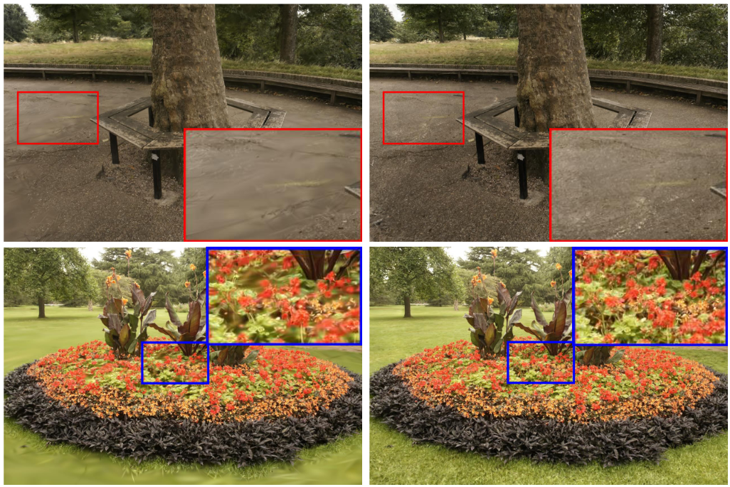 之后使用 GS 方法将 3D 高斯光栅化投影到 2D 平面。得到的投影图片与原输入图片投入到最小化损失函数中训练,训练后的结果如图: