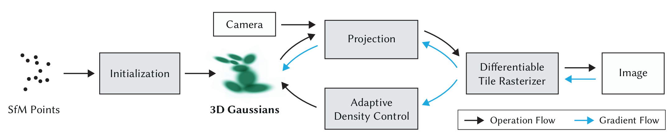 3DGS 方法主要是在三维空间中建立三维高斯函数,将三维空间的场景进行表示,之后再用光栅化技术,将其投影到二维平面上渲染。