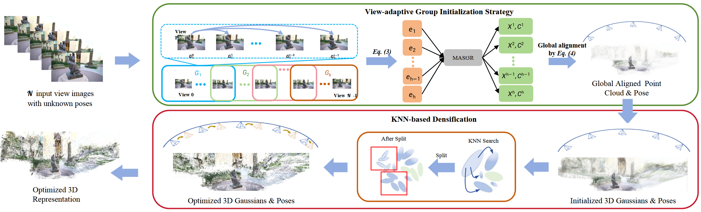 对于 SfM 初始化的问题,文中采用 DUSt3R 的双视图点云构建,由于 DUSt3R 的输入是双视图,而 3DGS 的输入是多视图,所以要拆分成多个双视图。对于双视图的匹配选择,文中采用各视图的相似性进行筛选,文中称为视图自适应的群组初始化策略(View-adaptive Group Initialization Strategy)。最后将输出的点云进行全局对齐,从而产生初始的点云图。