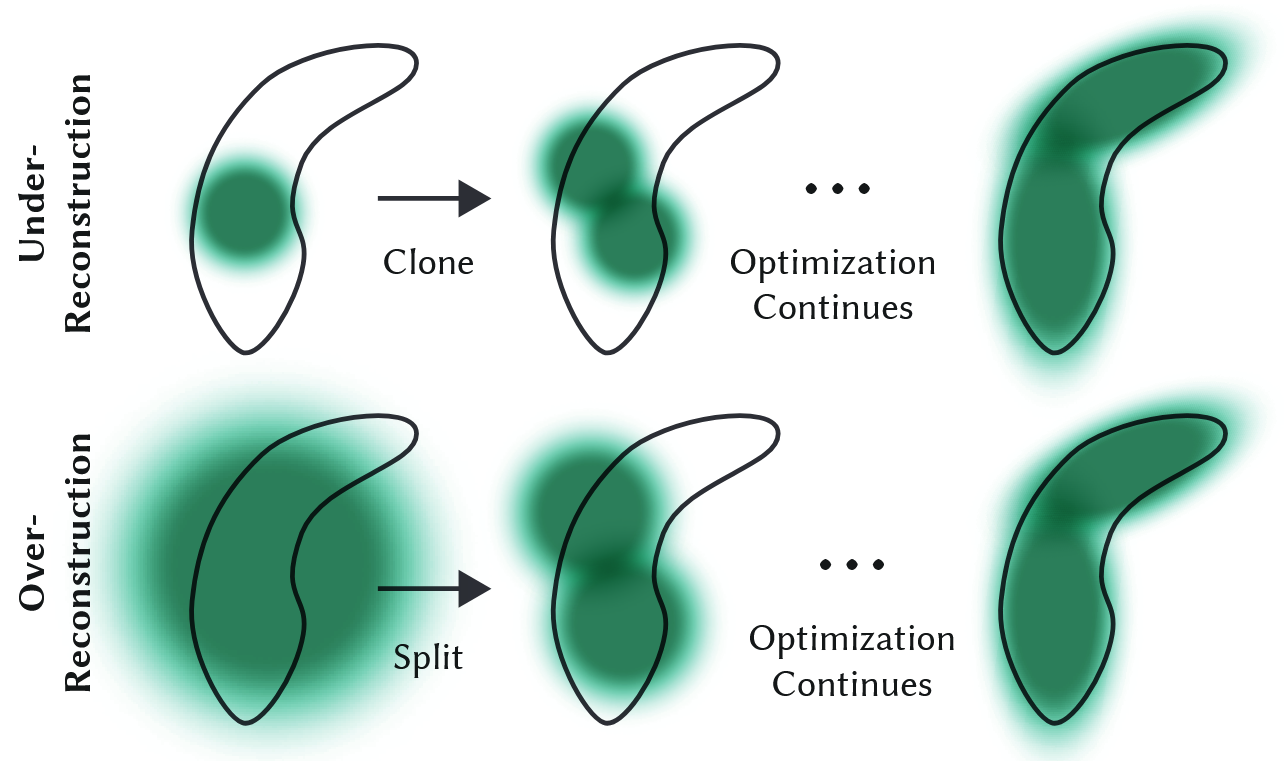 将点云的位置作为 3D 高斯的初始位置,生成一系列 3D 高斯,然而这些 3D 高斯并不能很好的表示 3D 场景,需要进行迭代优化。优化的策略就是自适应高斯致密化策略(Adaptive Gaussian Densification)。简单来说,生成的高斯有大有小,大的高斯没办法填充细节,于是将其分裂;小高斯对细节填充不完整,于是将其克隆;这样的策略在一定次数的迭代中根据平均梯度和阈值的关系进行调控,如图: