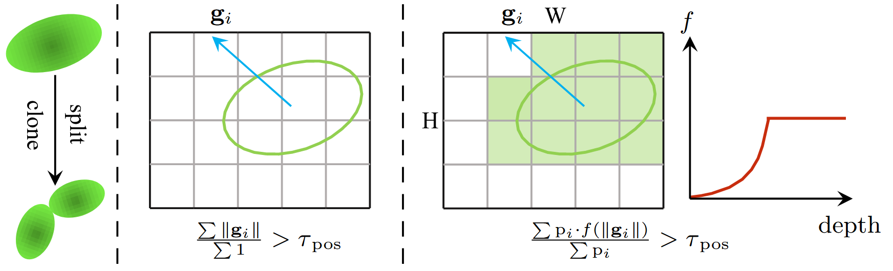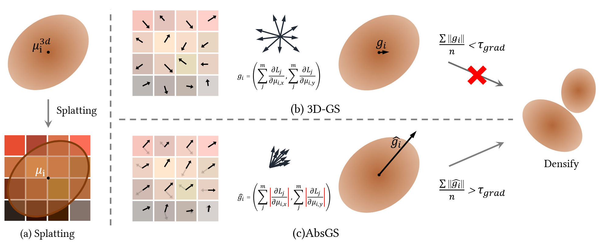 这篇文章注意到,3DGS 的渲染场景中存在问题,大高斯所在的背景区域存在模糊的现象,分析原因是许多本应该分裂的大高斯并未分裂。原来的 3DGS 对于大高斯的判定是高斯与真值间存在差异,差异会反映成梯度变化,因此取平均梯度与阈值比较。若平均梯度大于阈值,说明该高斯不属于该位置,而应该进行调整,于是进行分裂。